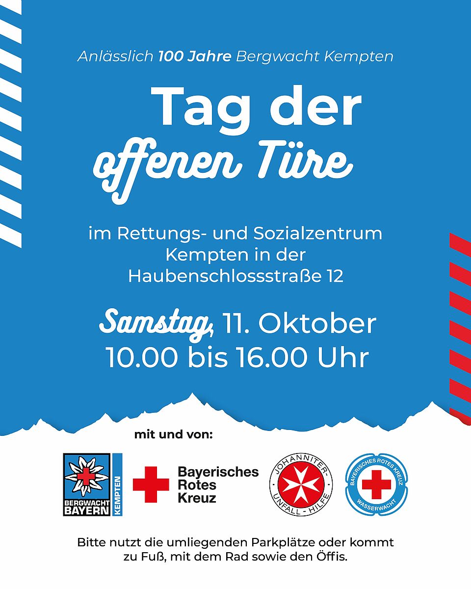 Am Samstag, den 11. Oktober, öffnen wir von 10:00 bis 16:00 Uhr gemeinsam mit weiteren Blaulichtorganisationen anlässlich der 100 Jahre Bergwacht-Feier unsere Türen im Rettungs- und Sozialzentrum, Haubenschlossstraße 12 in Kempten.